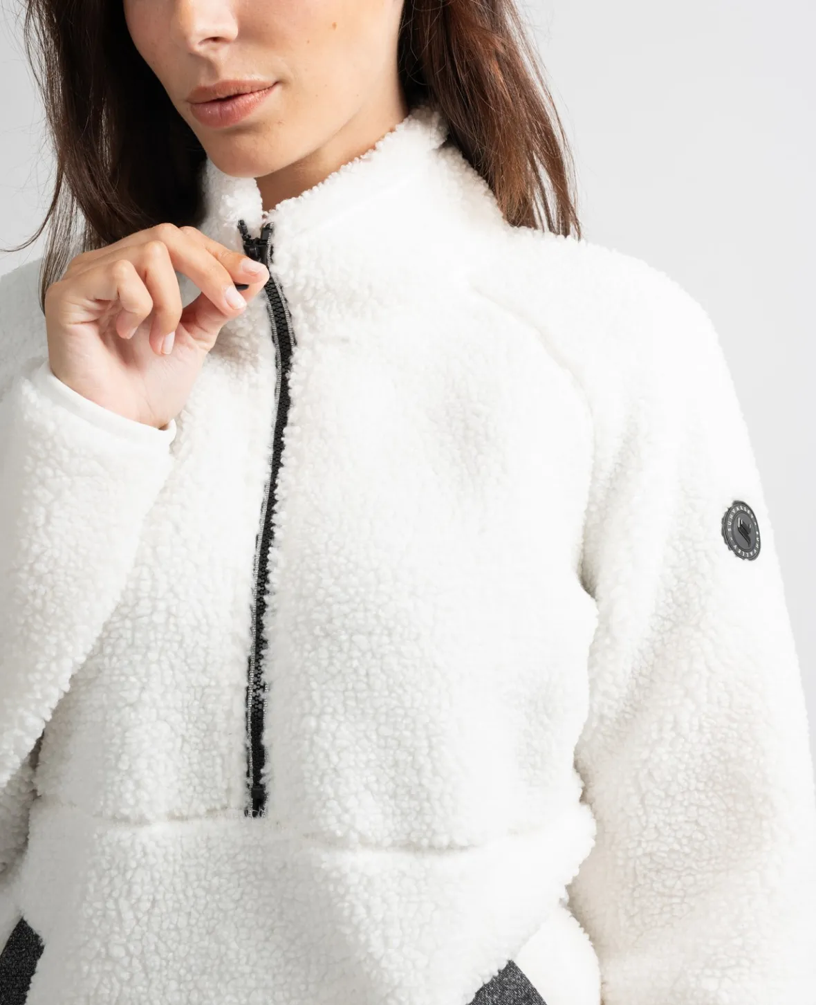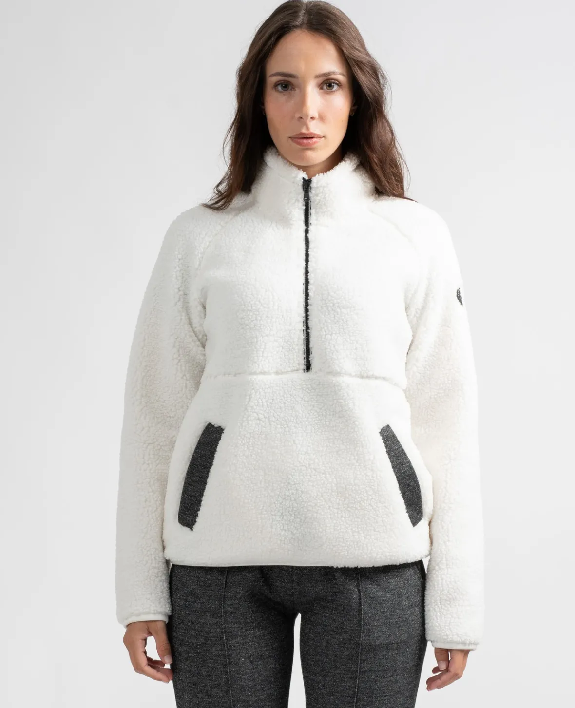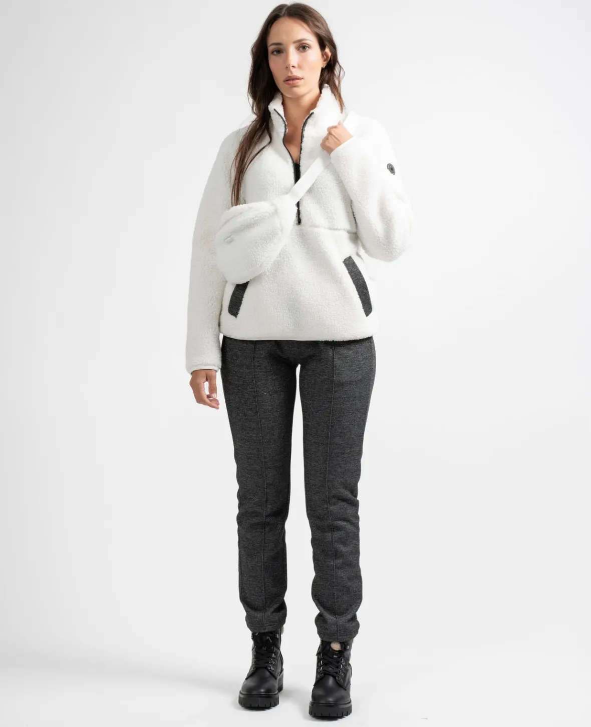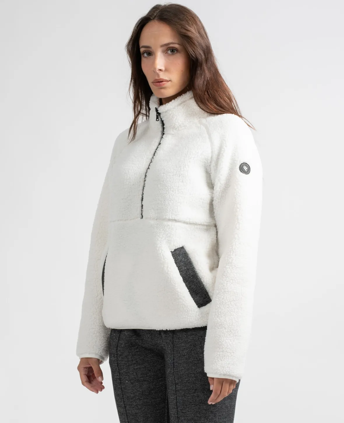 Un sweat tellement confortable qu’on aimerait ne jamais le quitter. Petites poches, col zippé et légèrement montant, il se porte aussi bien dedans que dehors.