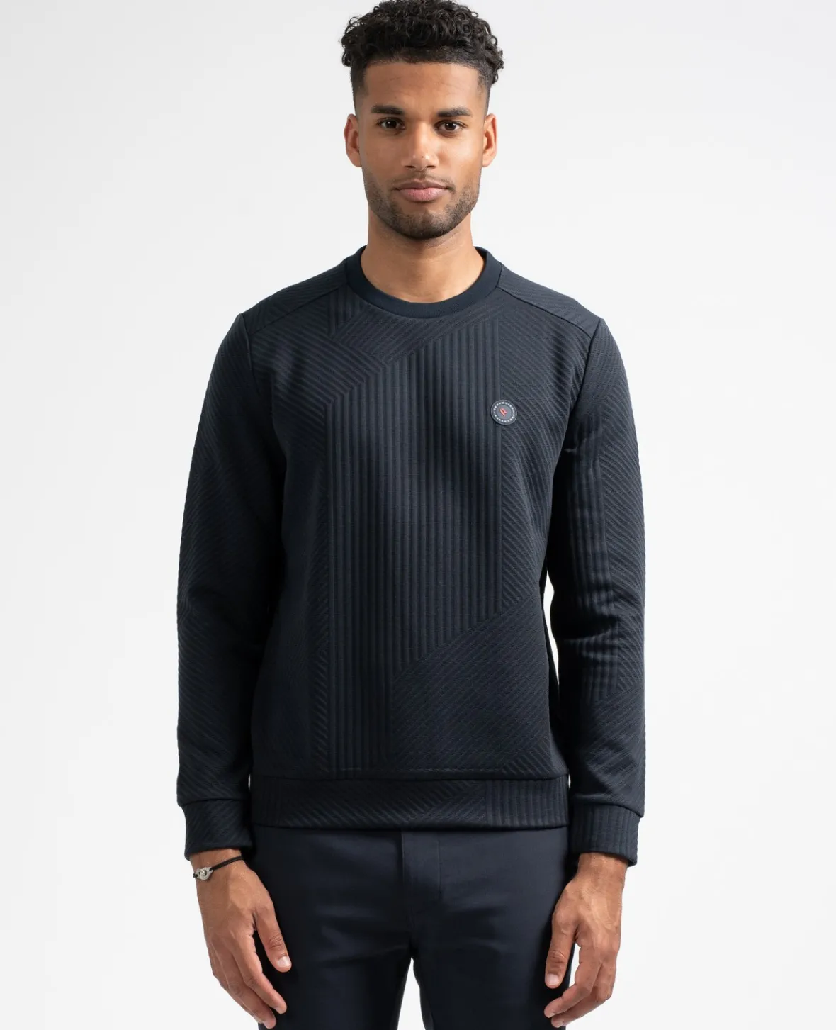 Sweat jacquard à col rond avec logo discret sur la poitrine. Doux et chaud, c’est un basique du dressing.