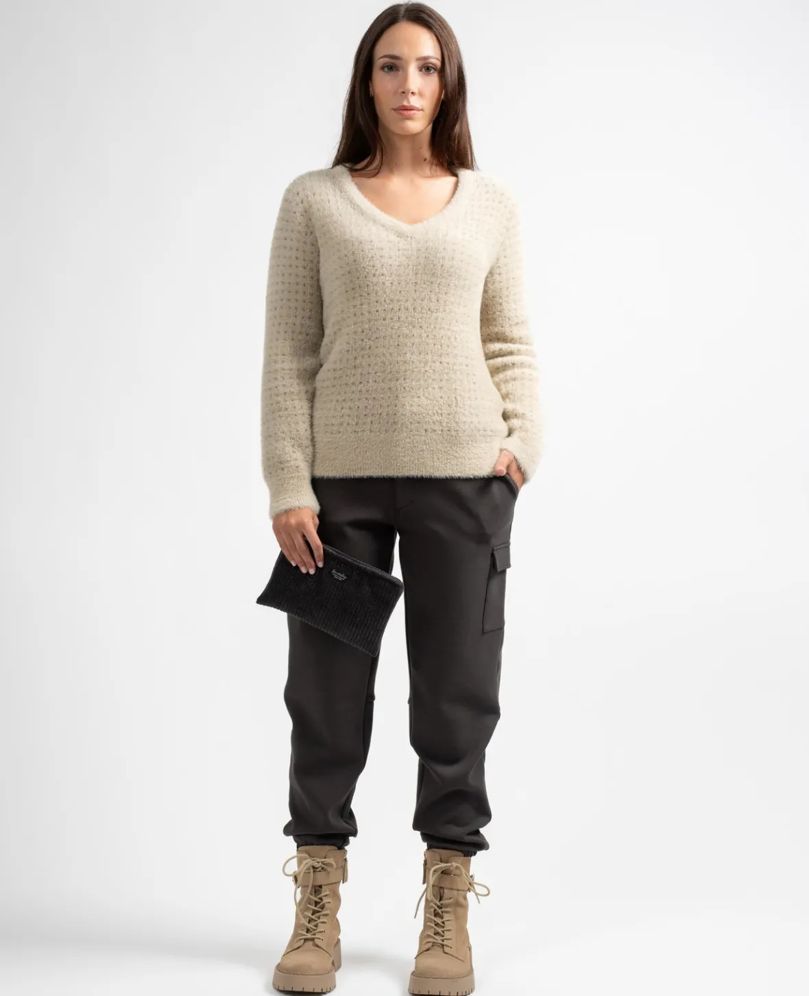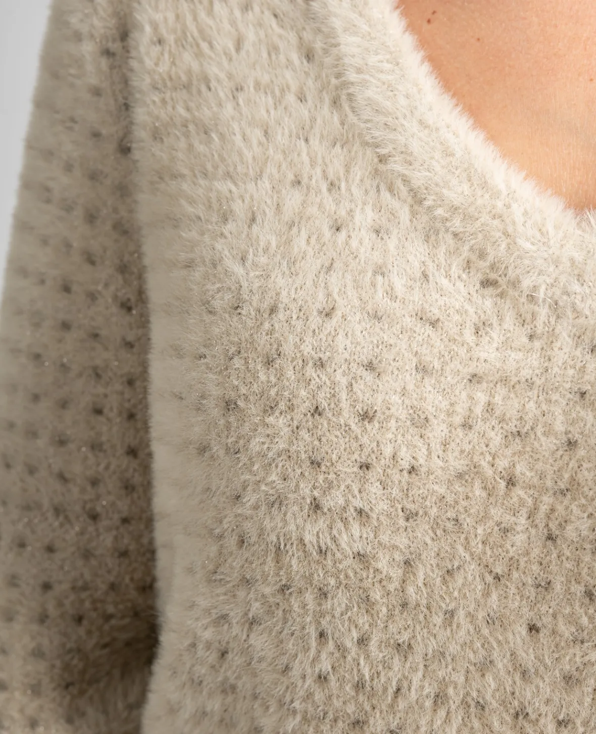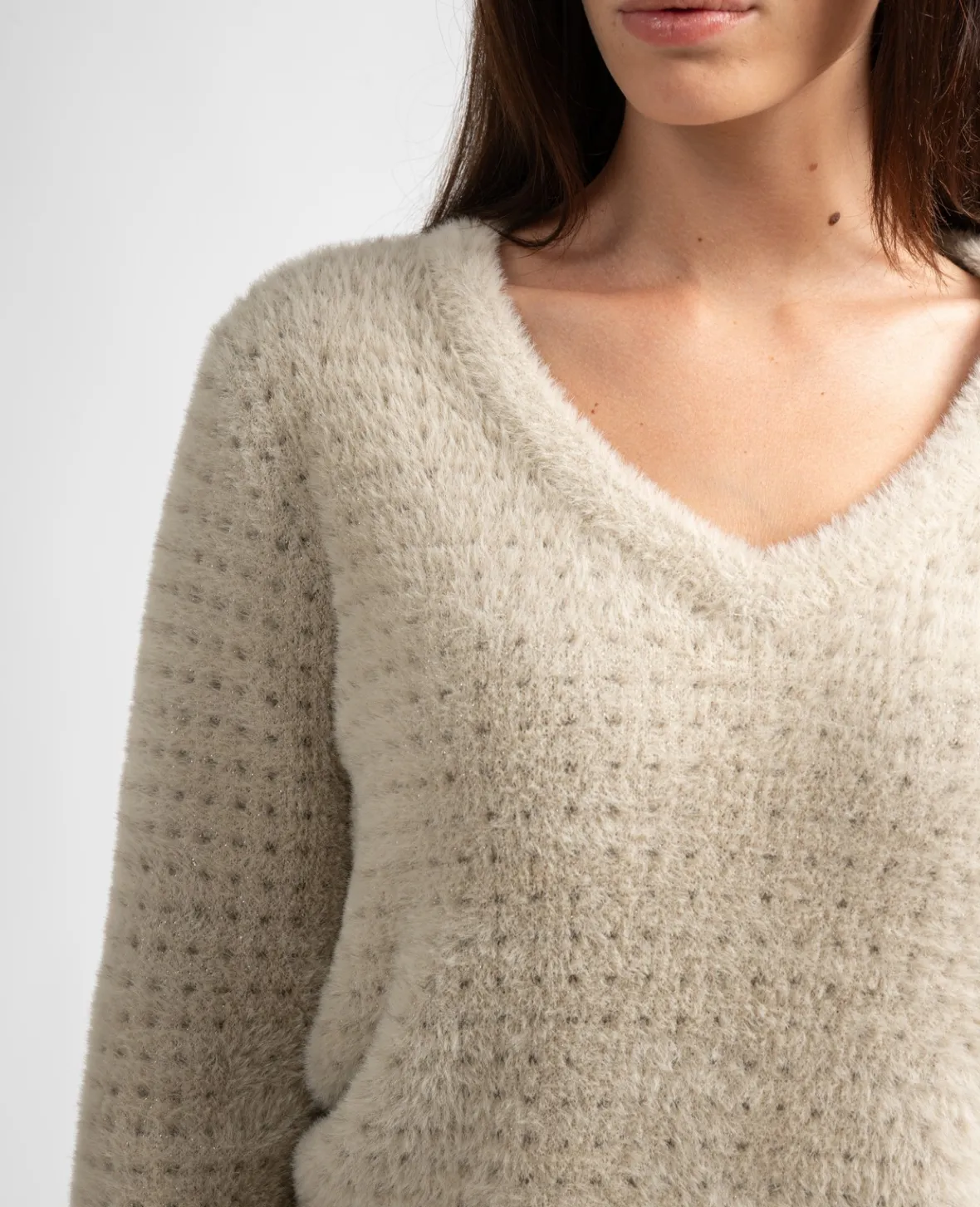 Apportez de la brillance à votre tenue avec ce pull en maille lurex. Son col V profond joue la carte de la féminité.
