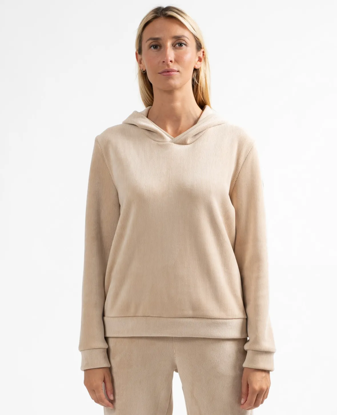Sa matière toute douce et sa capuche font de ce sweat celui qu’on ne quitte plus. Son aspect velours côtelé apporte un côté très actuel à cet intemporel du dressing.